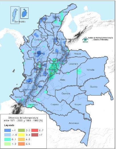 1. Los datos de temperaturas analizados desde 1971-2000 presentan variaciones de temperatura de 1 a 2 grados entre un departamento y otro, sin embargo la muestra mas representativa de temperaturas nacionales es de 14ºC en 6 departamentos de la Colombia ,los cuales hacen parte del 24.24% del total de temperaturas registradas en este intervalo de tiempo.